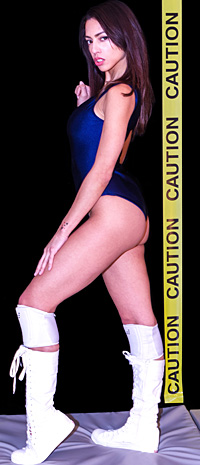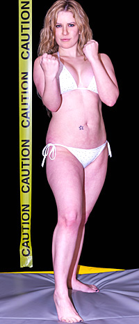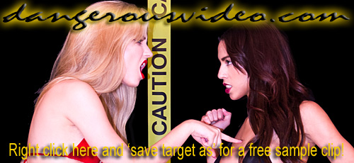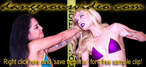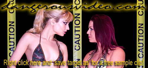 DC 266 - EDEN VS KAT Eden is starting to come into her own, achieving her first win and then battling Saya in a hellatious bout, the Puerto Rican beauty is looking to get back into the win column in a big time way against a former DC champ, blonde bombshell Kat! After a epic match against popular cat fighter Sara Brooke, the evil Kat is on the prowl for more victims on her way back into the title picture. And speaking of pictures, with both babes boasting the most picture perfect butts on the roster, we thought why not, for their first match up ever, have Kat and Eden in thongs? You're welcome! However, that's not the only place they're evenly matched. Not too many of the DC Girls can match Kat's legs but Eden is right there and maybe even stronger, and you can be sure they each take turns using them, with killer thighs wrapped around heads and mid sections, wearing each other down for some forceful pins like school girls and match books, along with chokes, full nelsons, a lotus lock, arm bars, and more! With both Kat and Eden this toned, stubborn, and competitive, the blonde's experience in high level matches may just be the difference. But is it difference enough to overcome Eden's passion and motivation? We're only giving away it's a sharp and painful ending for one whose body gets rocked. Then, left dejected and having to stare up at an extended posing session from the winner! Ouch, that's gotta sting!