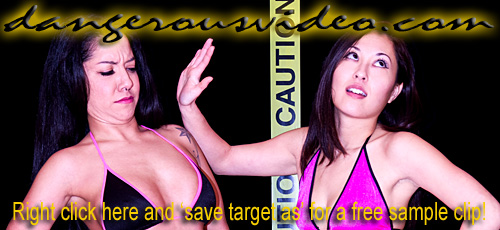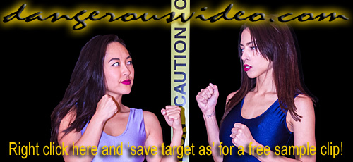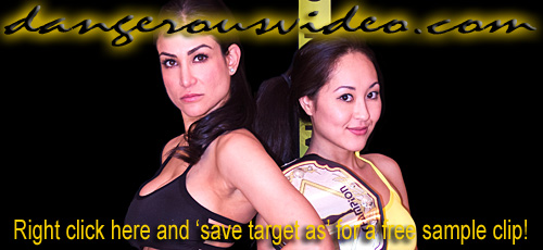 DC 268 - JINX VS LUCY 'Battle' of the Asians in this match as Vietnamese-American Jinx takes on the Korean-American Lucy! And what better time to have a tribute to our friends and partners in Japan, the makers of the famous Battle and Fighting Girls videos, akibacom.jp! So we outfitted the girls in those super sexy swimsuits that's their trademark, boots and knee pads, but have them go at each other Dangerous Curves Style! This is Lucy's first match after losing the title to Sumiko so she's revved up for a win, wanting to get back in the title picture. Jinx gives up a clear size advantage but makes up for it with her feistiness and energy, making it more difficult for the former champ to get a hold of her and grind her down, as Lucy is known to do. With both experienced grapplers, the results are more of a wrestling match than cat fight that sees both beauties employing anything and everything: breast smothers, body scissors, super tight pins like grapevines, school girls, match books and cross body; multiple guillotine chokes from both, a painful looking leg spread, a camel clutch, a shrimp hold, a bit of stomach punching, and lots more! This one is super close all the way through with both girls trading points and towards the end it's anyone's match! A narrow and last minute knock out finish has one's face stuffed in the other cleavage while constricted between her legs. There's no escape, only a prop to be posed on!
