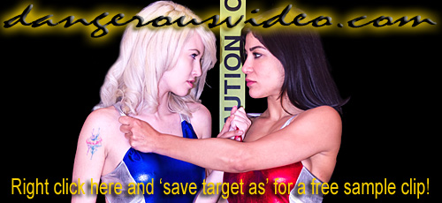 DC 272 - KAT VS JINX Always in a mood to rumble and get back in the title hunt, tall, blonde, and evil Kat's opponent is non other than short, brunette, and feisty Jinx! The quick and experienced Asian beauty is not at all impressed by the former champ and looks to make an example out of her on the way to what might be considered an upset win! Jinx is confident, Kat is arrogant; lets see which prevails! Fans know Kat will always run her mouth, but Jinx gives it verbally right back, not ready to let Kat try and ruin her confidence along with her body. Kat also has a history of struggling against smaller girls, (Just ask Sumiko!) so Jinx maybe realizes she has no need to be intimidated by the size disadvantage. We're gonna find out who has the most effective body scissors for sure: the taller girl with the reach or the shorter one who can keep herself wound around you, since both spend plenty of time testing each other that way, in addition to: some punching, spanking, and hair pulling; breast smothers, full nelsons, a lot of tight chokes, bow and arrows, pins, a lotus lock, Boston crab, and of course Kat's trademark head scissors. But surprisingly, the blonde beauty finds herself behind so will they be enough to get her back to even with the fun-sized Jinx? The look on the dejected but defiant surprise losers face will make that answer very clear!