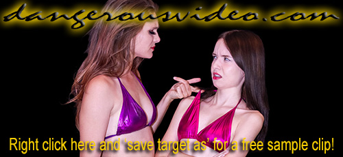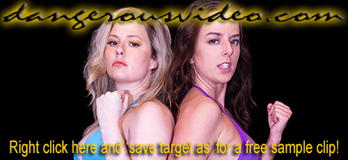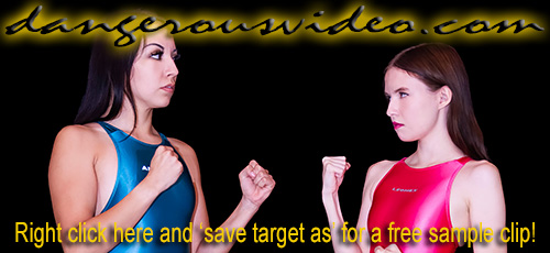 DC 3 90 - MILA VS MARIAThese two are difficult and don't like each other! Well, Mila doesn't like anyone really, especially always chipper, pretty girls like Maria, who's just always a ray of sunshine! Mila wants nothing more than to put out that ray of light again, and once and for all! Maria, on the other hand, kept it close in her debut, DC337, and now with more experience, thinks she has Mila's number! Let's see how it shakes out! To start, it shakes Maria's direction, who gets aggressive with Mila, catching her bigger enemy by surprise with her deceptive strength! All this seems to do is piss Mila off and soon enough, things are right back even! In fact, neither fighter babe is farther than two points ahead the entire match, and with multiple lead changes, it's anybody's match right up until the end! The girls lay it on each other with intense pressure moves including a variety of head scissors like: standing, figure four, and classic straight-legged squeezing! Flexibility contests with bow & arrows, legs locks, and a painful arm bar! Like pins? They try to hold each other down with the schoolgirl, cross body, and grapevine types with limited success! There's even a fair amount of hair pulling! Since Maria thought it was a good idea to wear pigtails, Mila targets them! The score is tied late when a pin comes, but the eventual winner decides to get another point and make the loser suffer just for fun, and leave her whimpering!