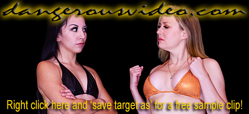 DC 380 - KAT VS BELLA LUXX You asked for her, you got her! We've had requests to bring in bondage model and catfighter Bella Luxx for a while, and finally the planets lined up so we could make it happen! And of course we were going to put her against the best Dangerous Curves has to offer! First: Kat! Can a famous fighter known for viciously getting catty convert that knowledge an be just as successful in our style? Especially against our resident poster girl and former champ? Yes, the answer is yes. At least to start! Bella gives Kat all she can handle and even gets out to a lead, which has Kat scrambling to catch up, as she has seen well how mean Bella can be, especially if she wins! Kat goes with what she knows, and maybe Bella doesn't, and keeps herself in the match with a variety of super tight and prolonged pins, keeping the score super close! In fact, there's never more than two points separation between the two beauties; a low scoring affair with grapevines, camel clutches, head scissors, guillotine chokes, body scissors, a lotus lock, and a lot more! It might have taken her a bit, but Kat strikes gold with moves she's sure Bella has never seen in her favorite style while Bella relies on hair pulling to get what she wants, then catches on and Lordy this gets good! With both high on the stubborn and competitive scale, it takes an incredible come from behind effort to seal a win and leave one knocked the eff out!
