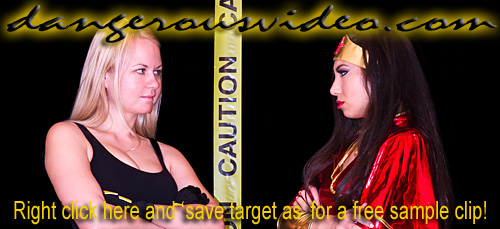 DC 193 - KAT VS ADRIANA CHRISTMAS SPECIAL! T'was the night before Christmas, and there on the mat, sexy Adriana took on a hottie named Kat. Their stockings slid up on their thighs smooth and bare. There was soon to be violence and pulling of hair! Our story begins with a highly pissed off blonde, Kat, still frosty from her title loss to Sumiko in DC187. Not in the holiday spirit about having to start from the beginning again, she asked for a rematch against beautiful 'South Beach Babe' Adriana, who was responsible for Kat's only other loss. The exotic brunette was all too happy to deliver another gift wrapped beating, but instead, got a Christmas surprise of her own! These two know each other well, having completed training together, and after their first meeting in DC177, have taken different paths to the naughty list. A point made clear as all Kat wants for Christmas is revenge, testing Adriana's flexibility with a Boston crab. This would be an on going theme, as Kat delivers up a sack full of maneuvers that gets a yoga toned Adri bent up in all sorts of painful positions guaranteed to melt your icicle! Kat is a pink nightmare and shoots Adri's eye out with matchbook pins, excruciating head scissors, lotus locks, and surf boards. Adriana, however, got some MMA lessons from Santa last year, competes valiantly, and tries to keep pace with Anaconda chokes, body scissors, and school girl pins. One vixen is in for a blue Christmas as her tormentor runs away with a win in spite of her best efforts, and delivers some kicks to her foe while she's down! So what else can we say about this magnificent fight? Buy this new video and you will have a good night!
